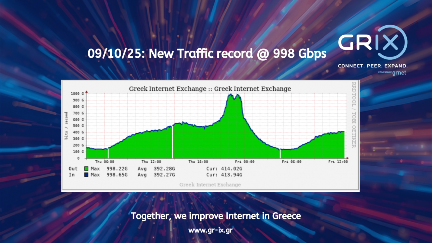 Το GR-IX, το Ελληνικό Internet Exchange, κατέρριψε το ρεκόρ κίνησης δύο φορές μέσα στον Οκτώβριο 2025. Συγκεκριμένα, στις 5 Οκτωβρίου η διακινούμενη κίνηση έφτασε τα 985 Gbps, ενώ στις 9 Οκτωβρίου σημειώθηκε νέο ιστορικό υψηλό, αγγίζοντας τα 998 Gbps — το μεγαλύτερο ρεκόρ κίνησης που έχει καταγραφεί από την ίδρυση του GR-IX.